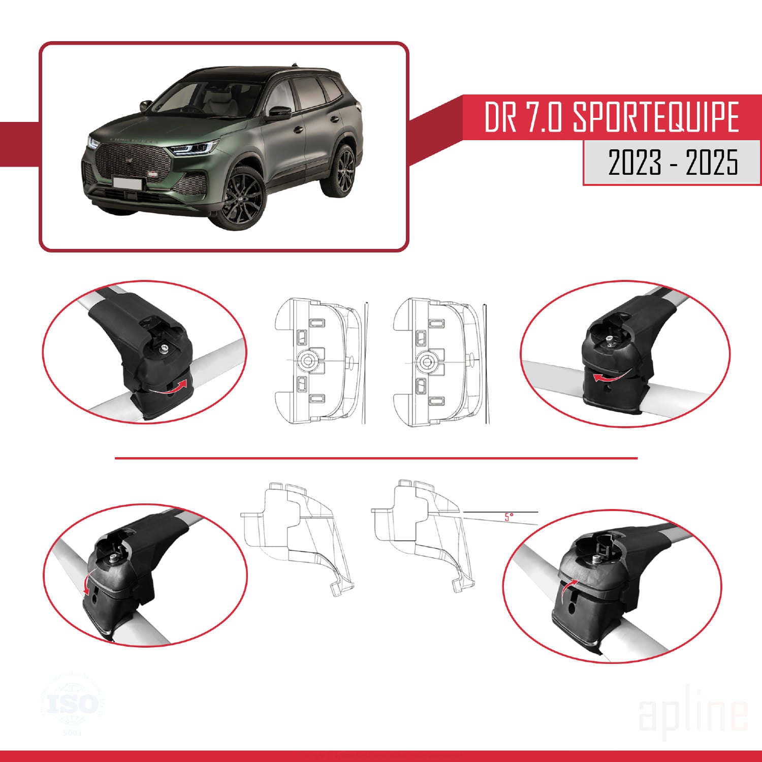 Die Halterung umschließt die Dachreling des Fahrzeugs von oben und von den Seiten und ist sicher befestigt. Dank ihrer patentierten Konstruktion kann sie sich um 3 bis 5 Grad in der XY-Ebene entlang der Z-Achse und in der ZY-Ebene entlang der X-Achse drehen. Zusätzlich ist eine vertikale Bewegung entlang der Z-Achse möglich.