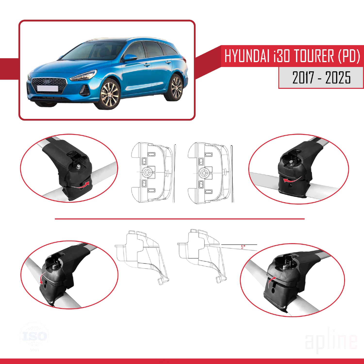 It grips the vehicle roof rails from the top and sides and is firmly fixed. The bracket, which grips the roof rails during connection, has the ability to rotate between 3 - 5 degrees both in the XY plane in the Z axis and in the ZY plane in the X axis thanks to its patented structure. It also has the ability to move vertically in the Z axis.