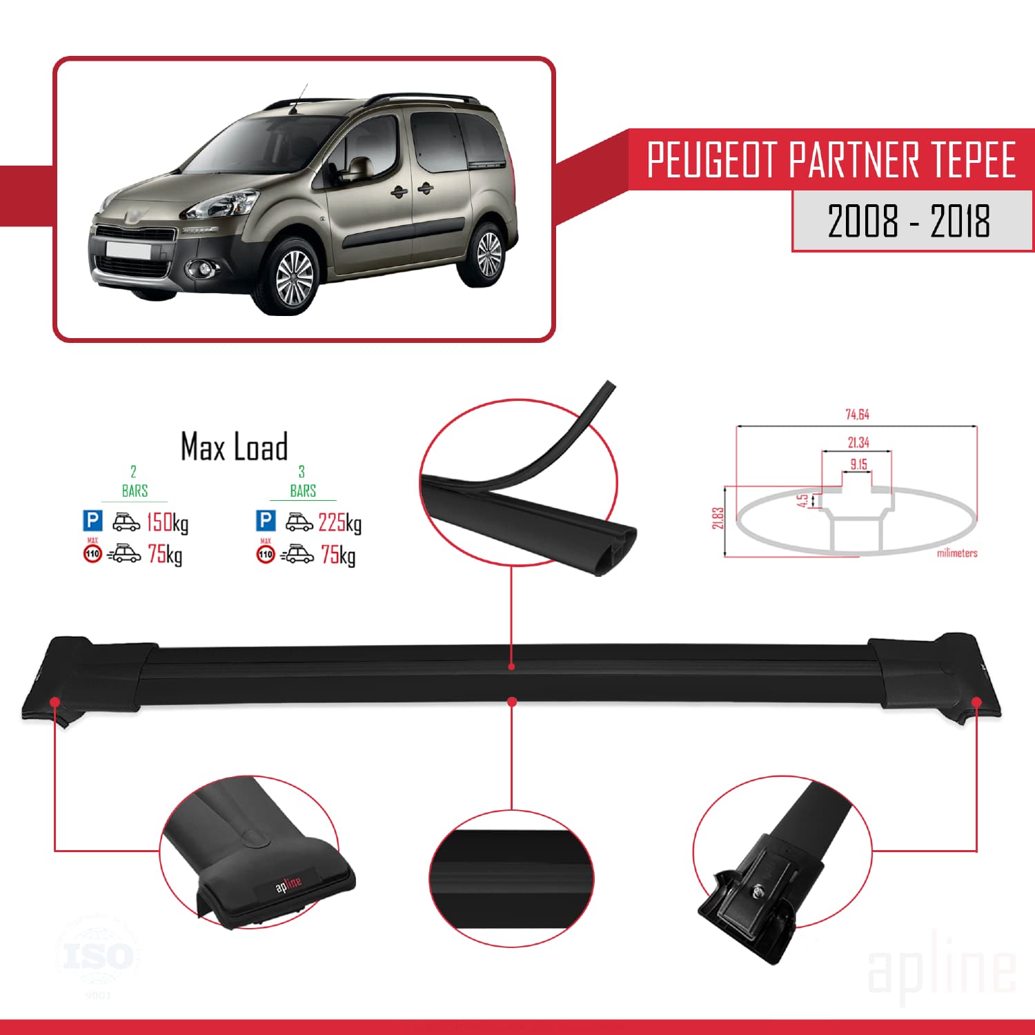 Compatible with Peugeot Partner 2 Tepee 2008-2018 FLY Model Car Roof Rack Cross Bar Black Aluminium 2 Bars