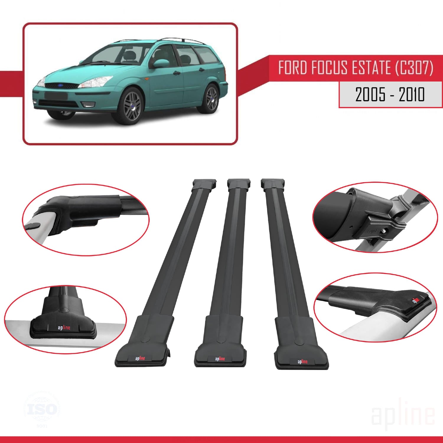 Compatibile con Ford Focus 2 (C307) Station Wagon 2005-2010 modello FLY Barre portatutto per auto Portapacchi in alluminio nero 3 barre