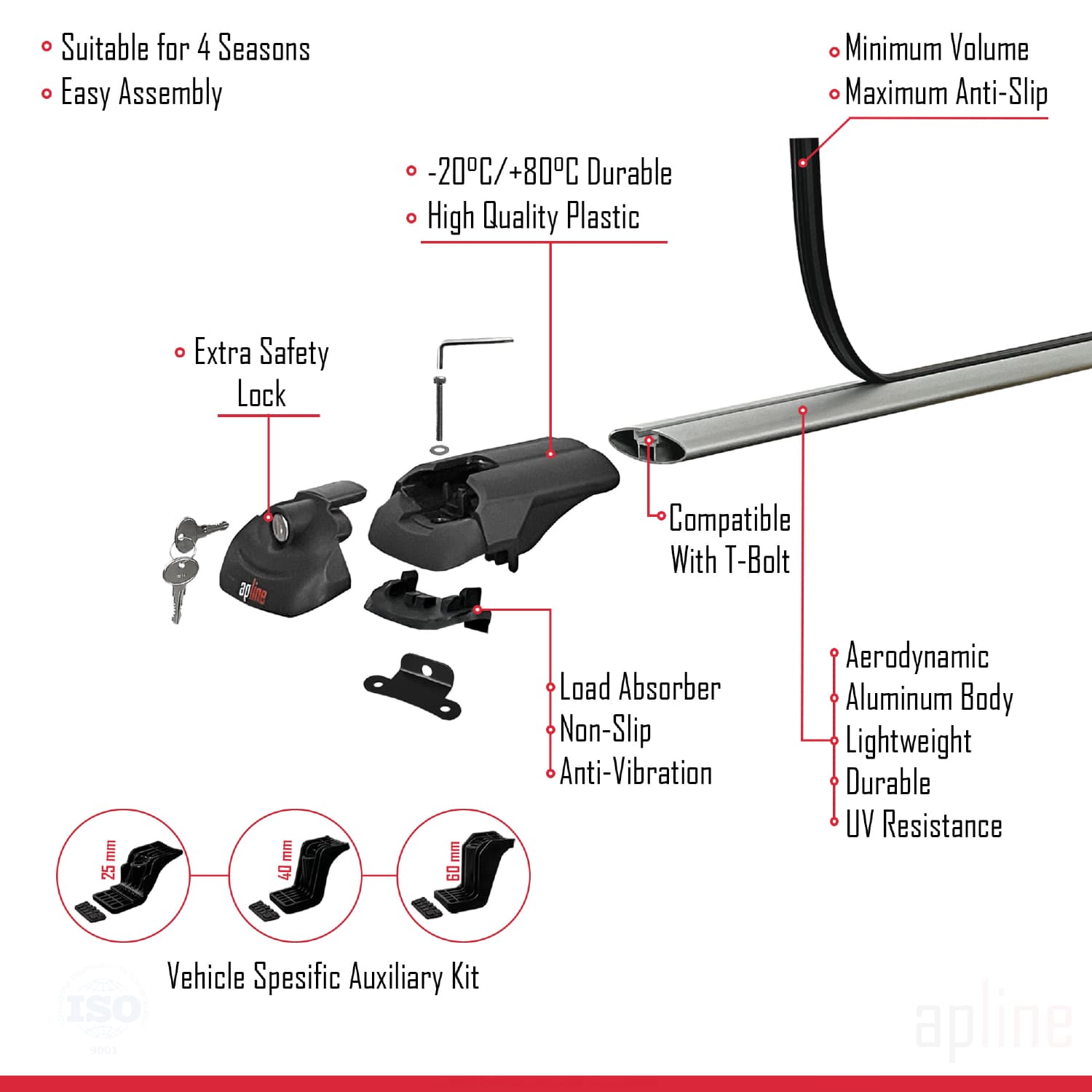 Il est utilisé pour transporter des charges sur votre véhicule. Il est nécessaire pour l'installation de porte-vélos, de porte-skis et de produits de type coffre de toit. Ce produit est monté sur les barres de toit du véhicule. La limite maximale de charge transportée avec ce produit dans un véhicule en mouvement est de 75 kg. (Indépendamment de 2 ou 3 barres en aluminium, la limite légale est de 75 kg).